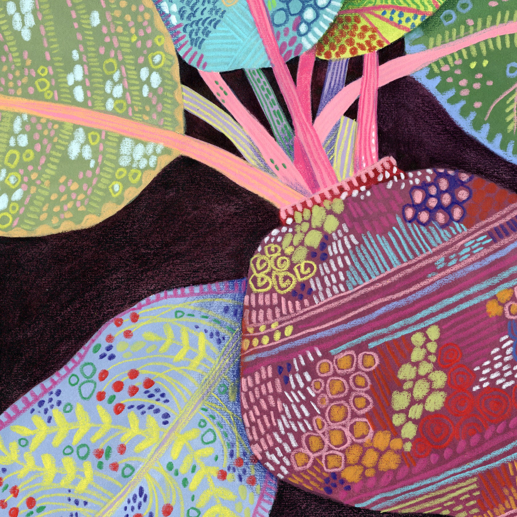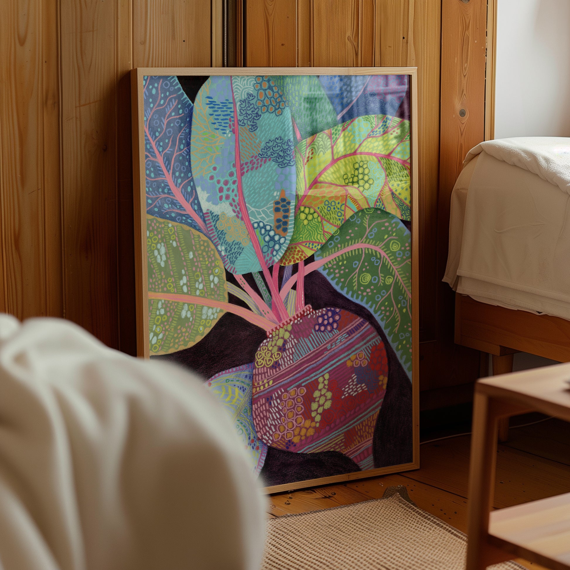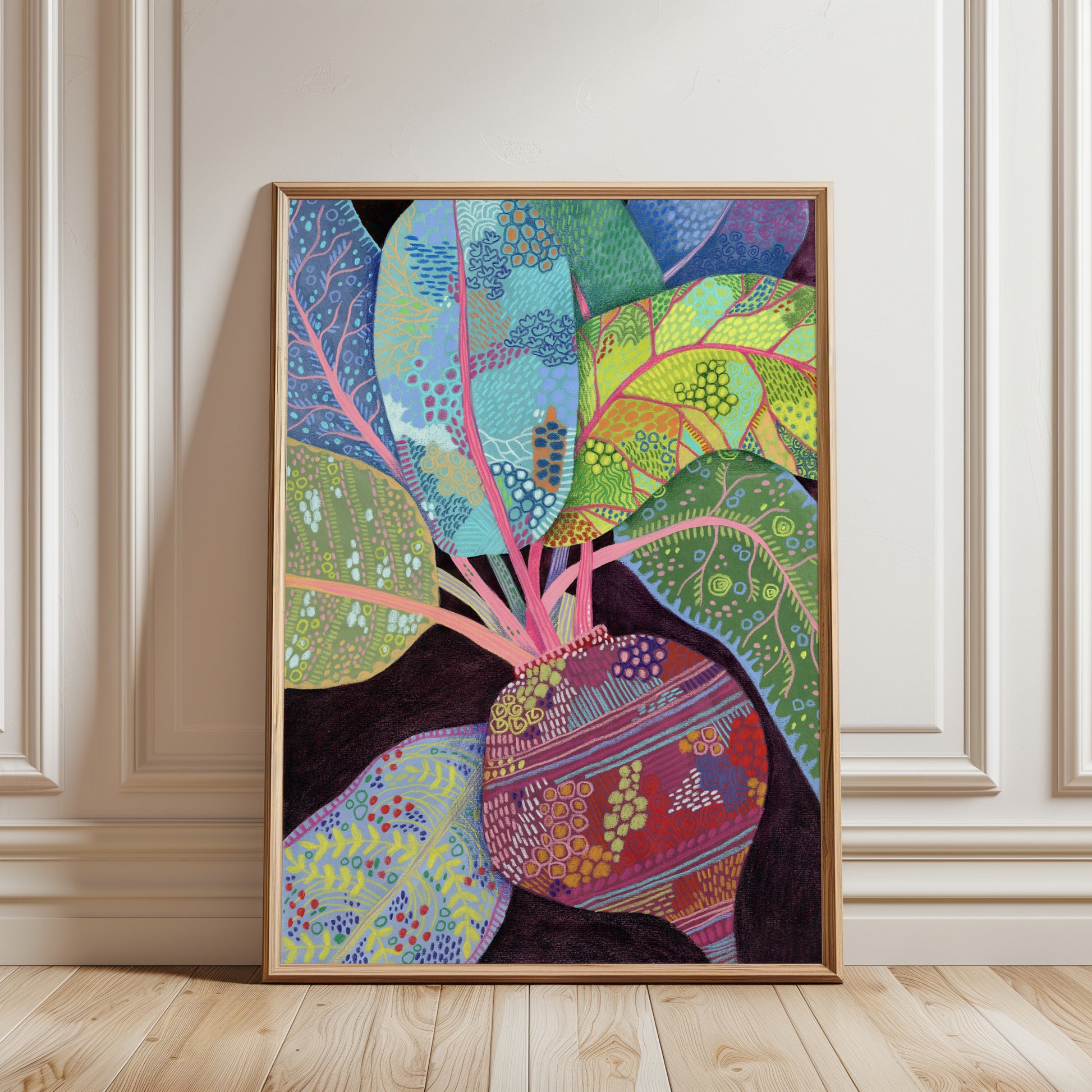 A vibrant beetroot with lush patterned leaves on a deep background, painted in a modern folk style. This fine-art print keeps the visible brush and pastel texture, adding warmth and color to kitchens, dining rooms, cafés, and farmhouse interiors.