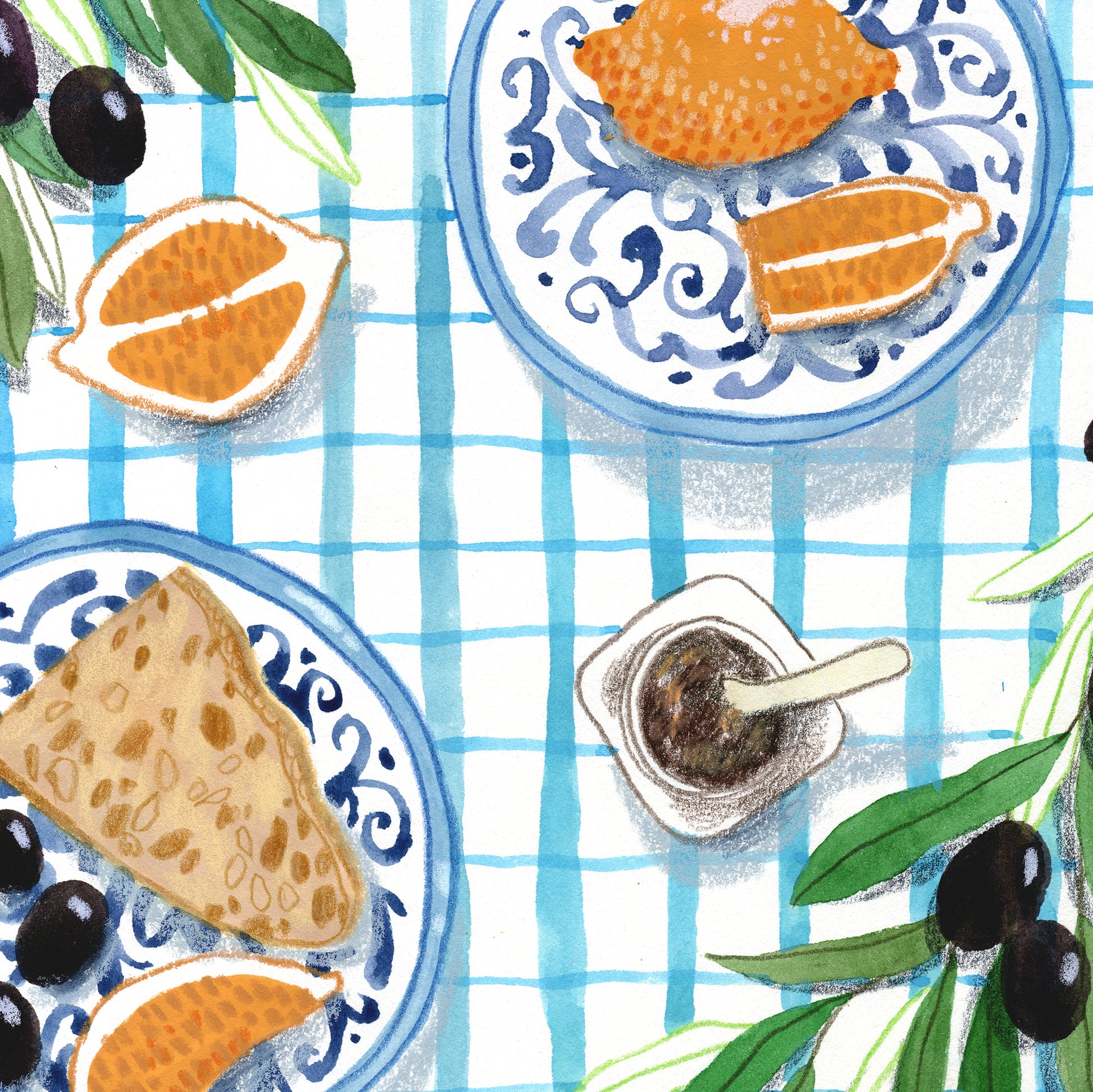 Mediterranean Breakfast Art Print: Olives, Bread, Gouache Kitchen Decor