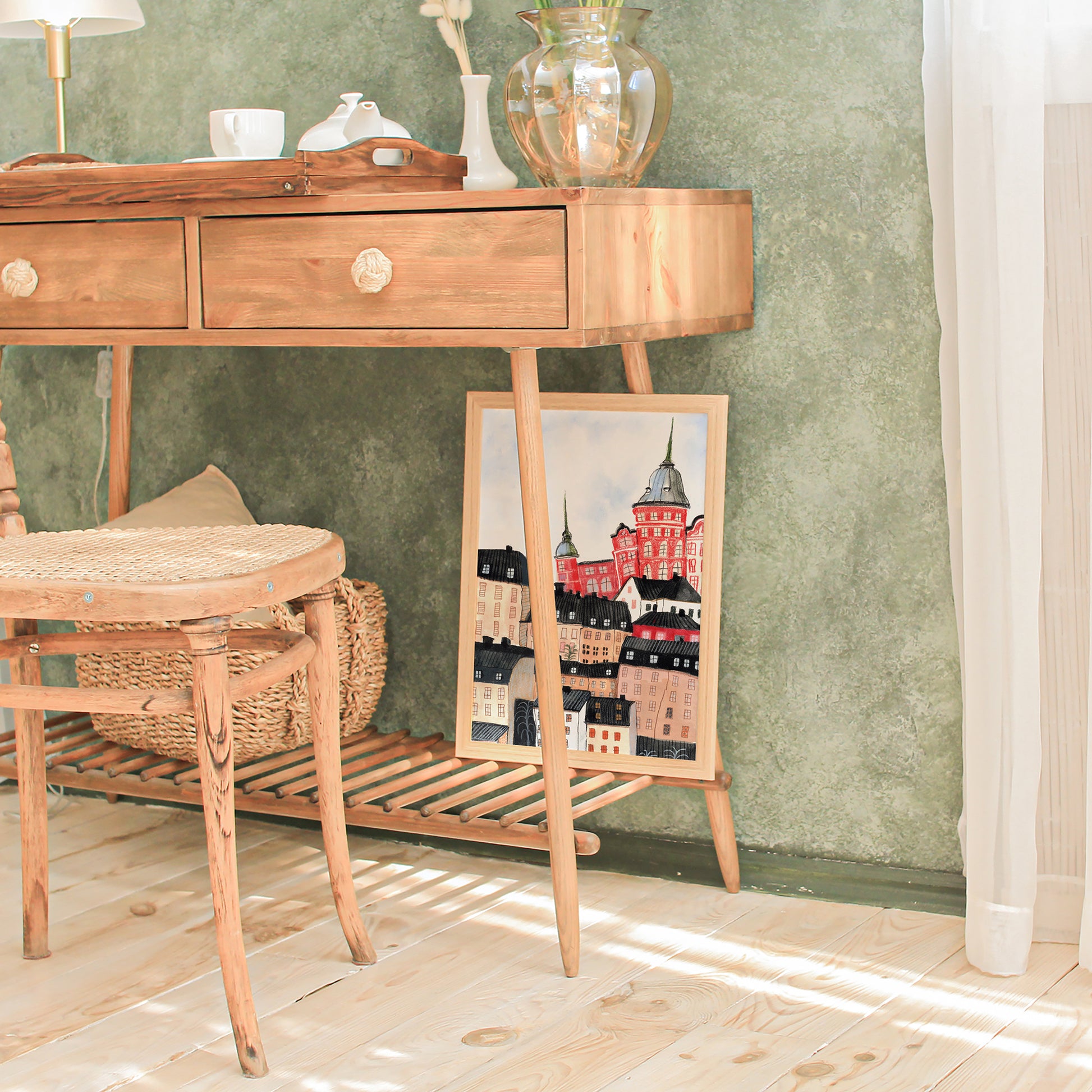 Created with gouache and pastel techniques, this artwork highlights the unique character of Scandinavian urban landscapes. It’s an ideal addition to any home, bringing a touch of Nordic sophistication to your living room, office, or study.